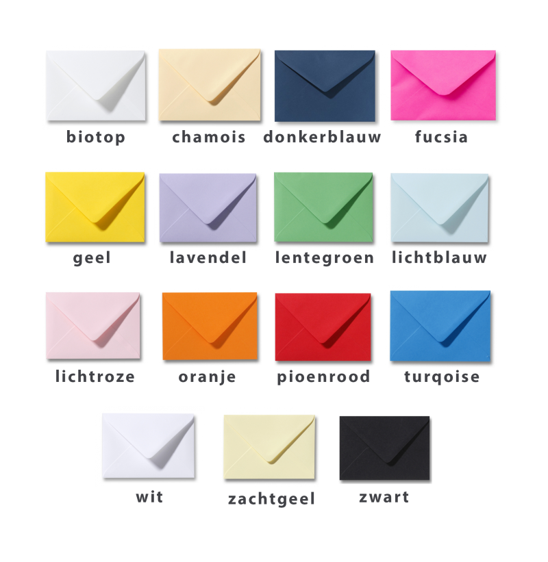 Er zijn veel verschillende kleuren enveloppen beschikbaar. Grote kans dat de lievelingskleur er zeker bij zit.